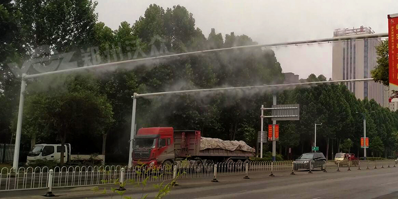 鶴壁道路龍門架式降塵項目,將高壓微霧噴頭安裝于龍門架頂部,對來往車輛進行高壓微霧降塵。